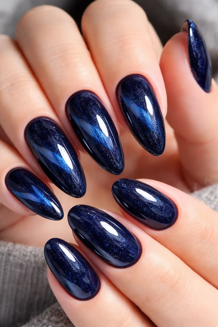 Deep, rich colors define midnight-inspired almond nails for winter 2026. Shades like black, navy, and deep plum create a dramatic base that feels both classy and festive.