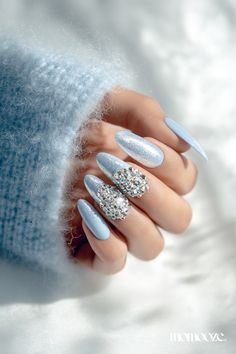 Cool-toned designs dominate winter almond nails in 2026, with silver taking center stage. Shades like icy blue, gray, and white create a crisp, clean look that feels modern and elegant.