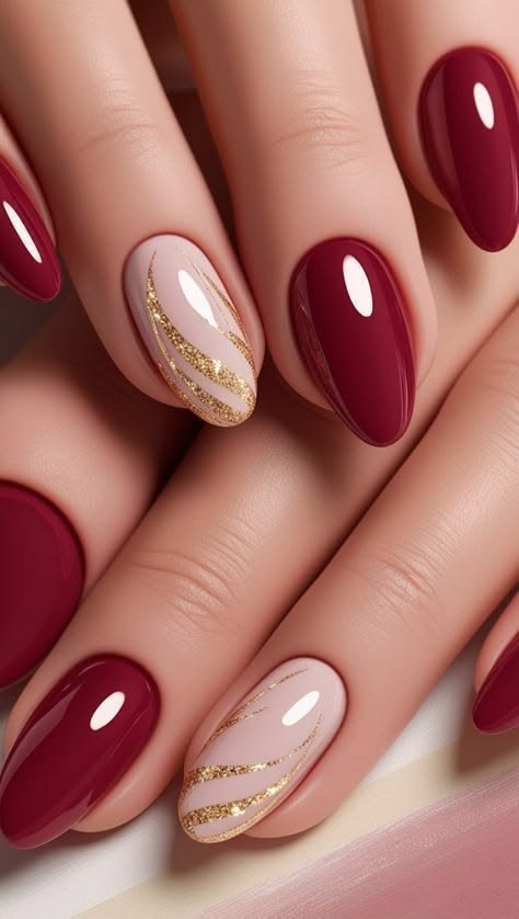 Gold accents bring warmth and luxury to winter almond nails in 2026. This trend focuses on combining neutral or deep bases with metallic details that stand out beautifully.