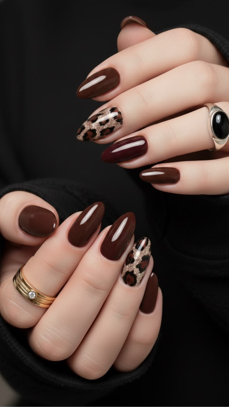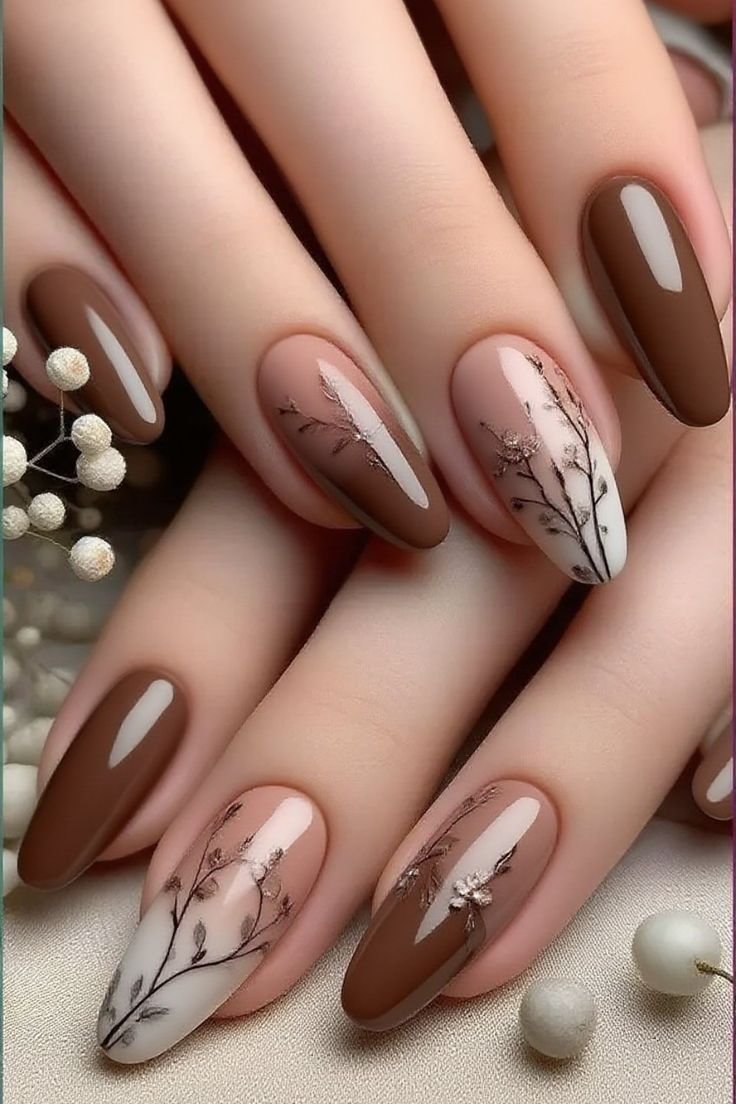 Shades like beige, brown, and burgundy are enhanced with gold foil, striping, or glitter. Classy designs keep the metallic elements minimal, while cute styles add small decorative touches like tiny stars or abstract shapes.