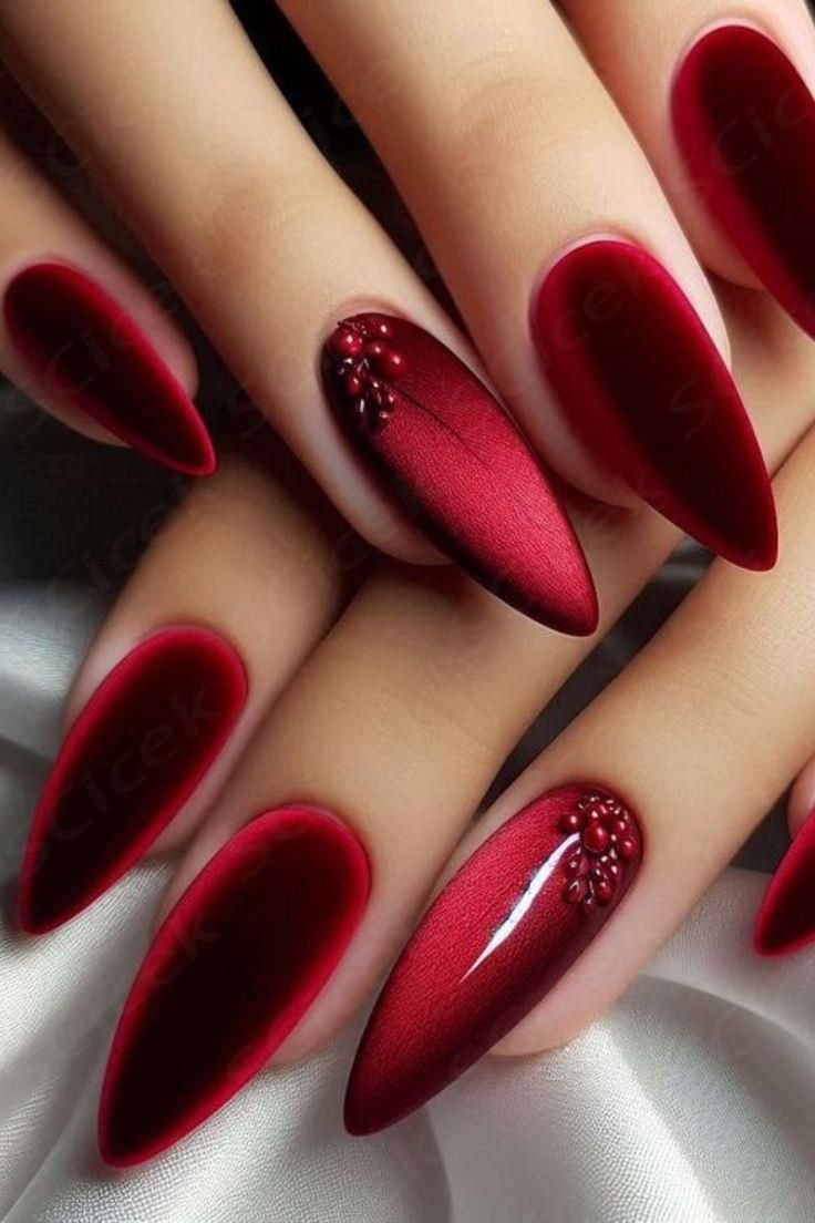 Matte topcoats paired with glossy details create a striking contrast. This trend is perfect for evening events or holiday celebrations, offering a sophisticated yet eye-catching manicure.