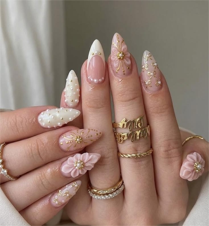 Festive touches include combining pearl finishes with glitter or metallic details. The almond shape complements this trend by adding sophistication and length.