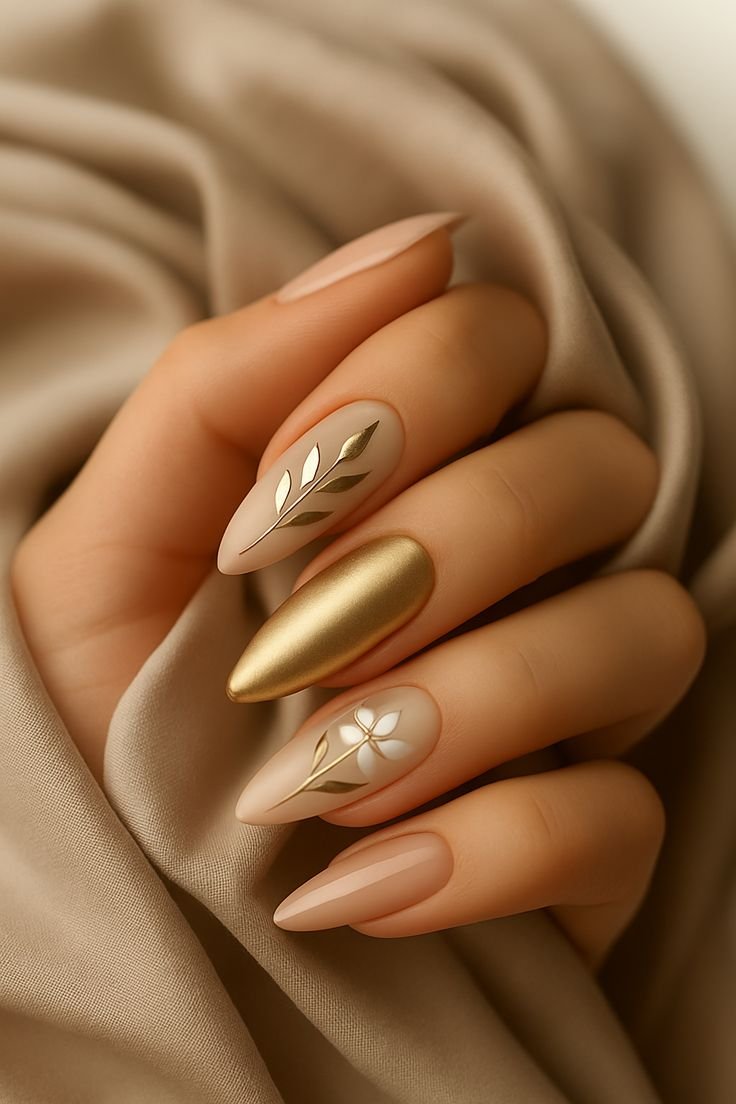 Golden accents elevate even the simplest manicure, making almond nails feel luxurious and eye-catching without being overly dramatic.