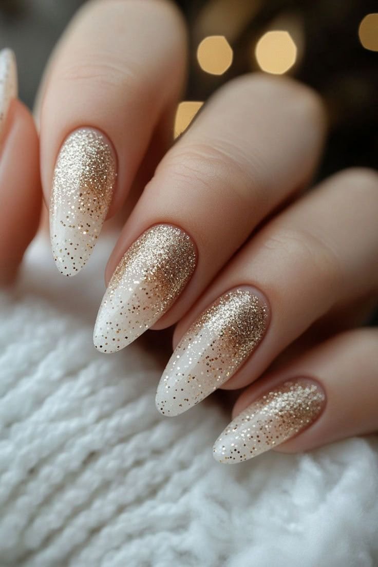 Cute styles include tiny snowflakes or star patterns, while festive looks embrace bolder glitter gradients. The almond shape enhances the overall elegance, making these designs suitable for any occasion.
