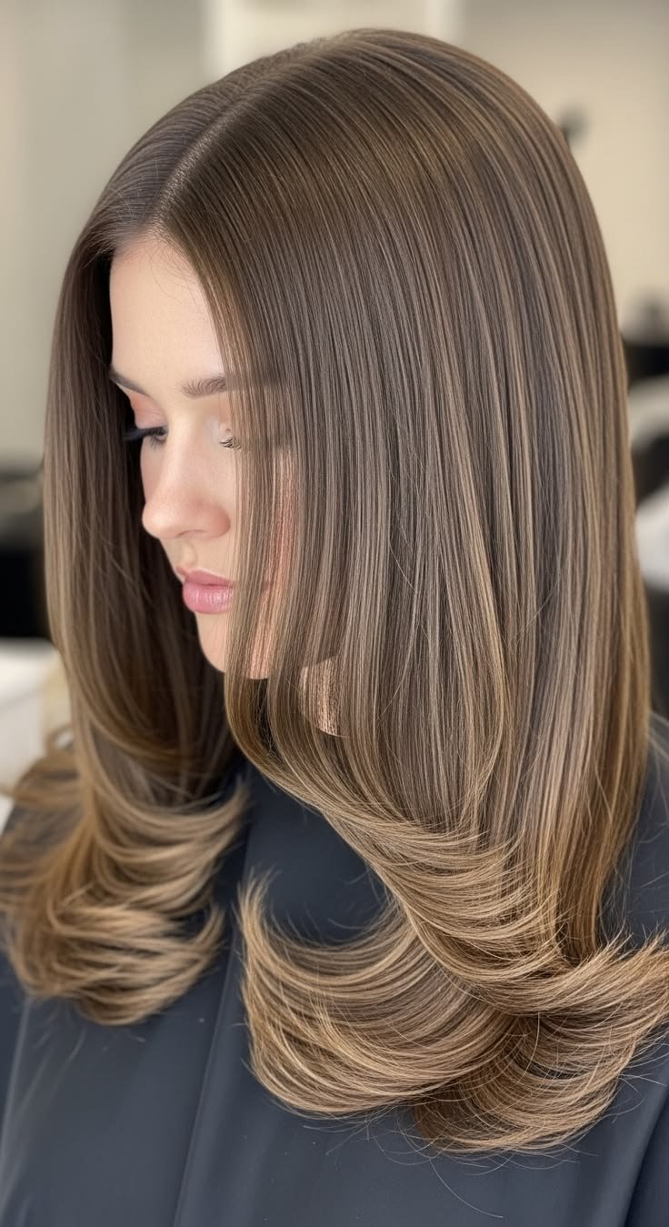 Ultra-straight, glossy hair reflects winter light beautifully. Use heat protectant before flat ironing and finish with shine spray. This sleek style complements structured winter fashion and bold lip colors.